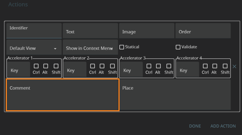 Comment specifies the text that is displayed on hover and usually describes the action.