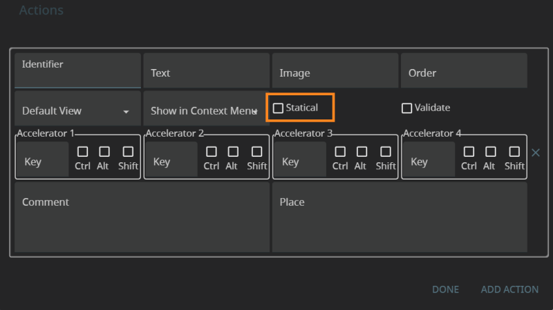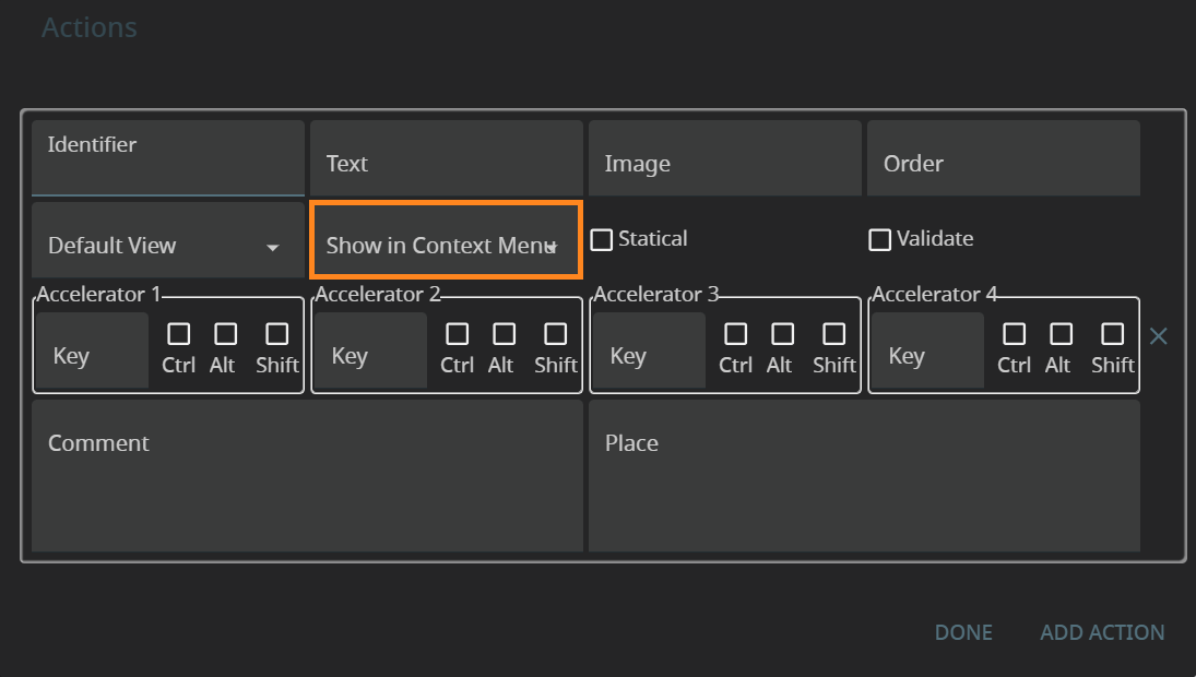 Show in Context Menu determines whether the action can be triggered from the context menu.