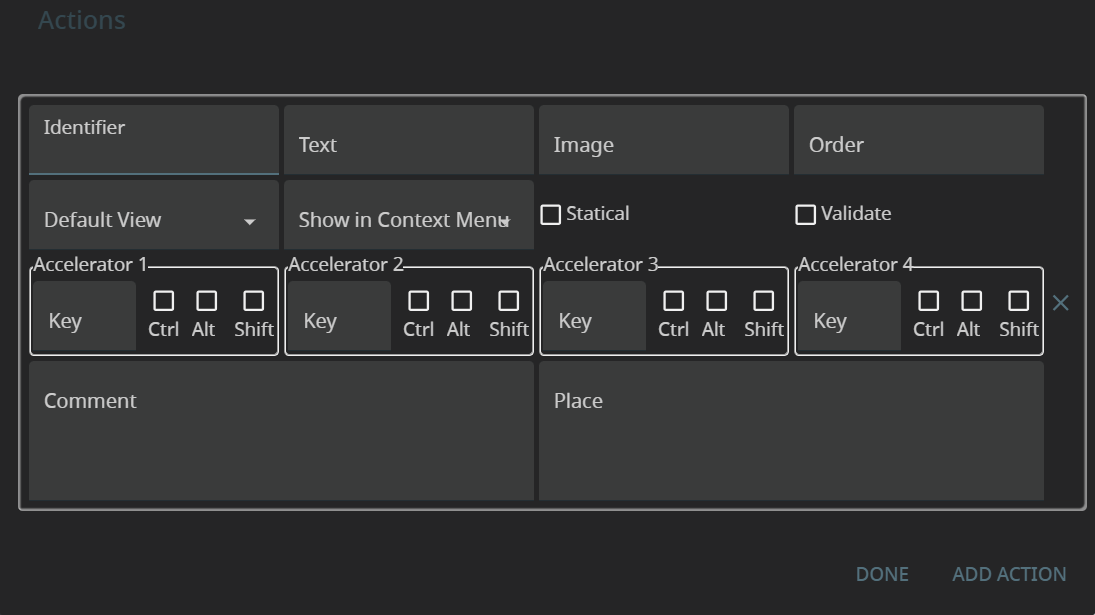 Every form element of a .fm2 form file has a property, Actions, that allows creating triggers for application actions: