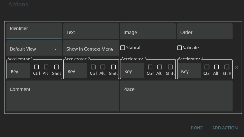 The algorithm of creating a trigger for an application action in an Action Defaults file is almost the same as in the .fm2 form directly. The difference is in the scope to which this action will be applied: