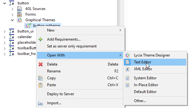 Besides Lycia Theme Designer, LyciaStudio incorporates an XML editor which allows 4gl developers to trace the changes added to theme files and edit user themes as a text or XML file: