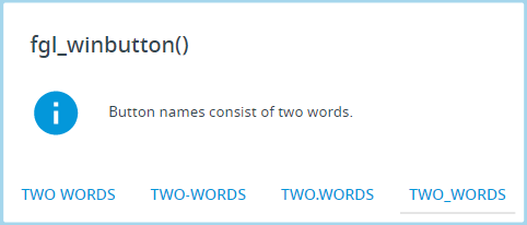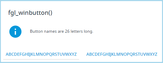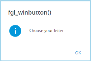 CALL fgl_winbutton("fgl_winbutton()", "Choose your letter.", "A", "", "info", 1)
