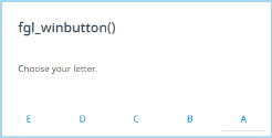 CALL fgl_winbutton("fgl_winbutton()", "Choose your letter.", "", "A|B|C|D|E", "info", 1)