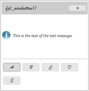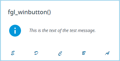 CALL fgl_winbutton("Title of the message", "This is the text of the test message.", "A", "A|B|C|D|E", "info", 1)