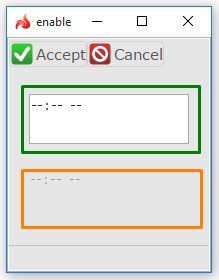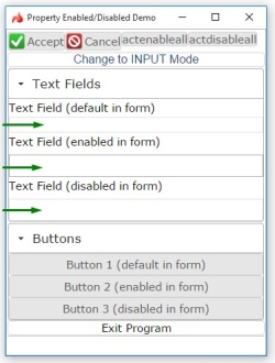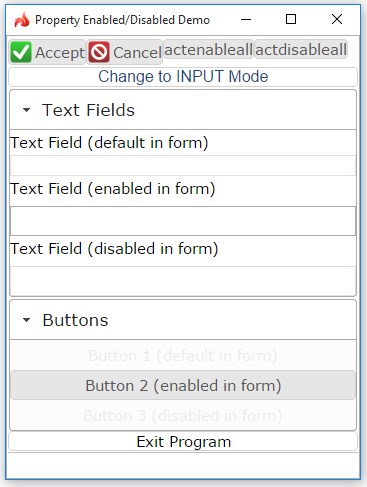 With the enable property set to false, widgets and containers become inactive at runtime:
