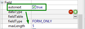 The property is particularly useful with fields intended for the data strings of a certain standard length (like birth and application dates, numeric postal codes, tax reference numbers, etc.). autonext can also be used for the fields 1 byte long in order to increase the interface user-friendliness (in this case one and the same keystroke will enter data and move input to the next field).