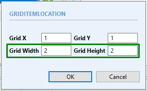 3. Set values for GridX, GridY, Gridheight, and GridWidth (all of them) for your ui.GridItemLocation variable via the LET statement: