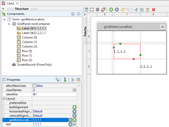 In Lycia Form Designer, gridItemLocation is set automatically after you add the form element to the GridPanel:
