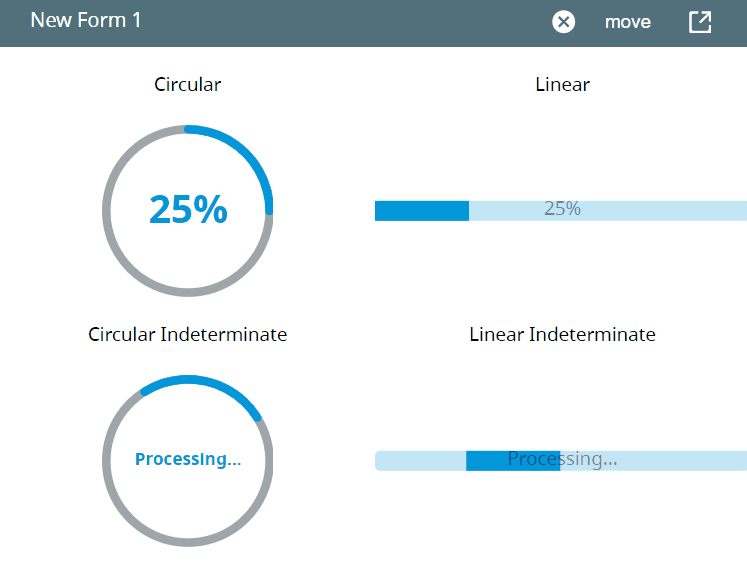 Now, we have examples for every type of ProgressBars. As a final step, we will compile and run the program. At runtime, when we press the Move button in the program’s Toolbar, the Circular and Linear ProgressBars will show the progress in percentage, and the Indeterminate ProgressBars will have the animation of a process going on:
