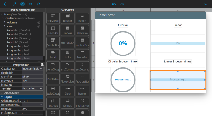 Next, we will edit the lower-left ProgressBar (pbar2) into a Circular Indeterminate one. For this one, we use the following parameters: