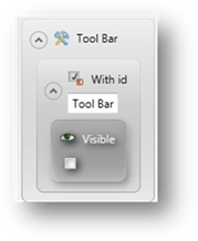 By default, the window level toolbar is always visible. It can be either the default toolbar or the toolbar created using the theme file. To hide a toolbar of a window, add the toolbar from the Tree view to the Styles view, then add the Visible property to this toolbar and leave the checkbox unchecked: