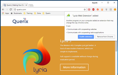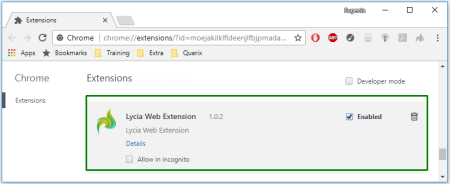LyciaWeb extension for Google Chrome is installed together with the Lycia software package and must be enabled after the installation is complete: