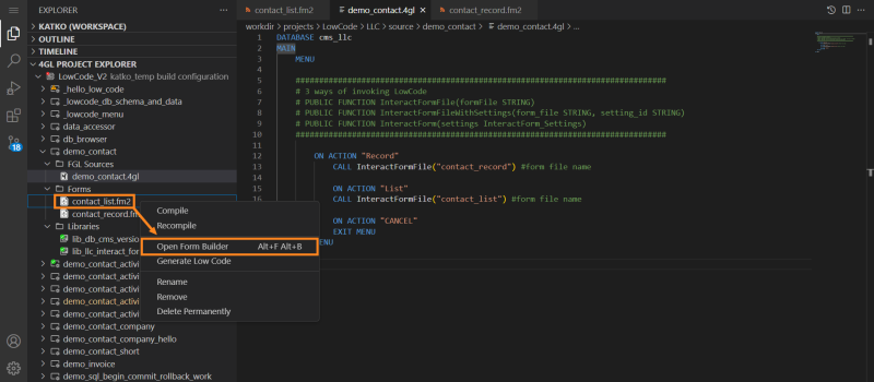 Step 2. Right-click the form file in FGL Project Explorer, and select the Open Form Builder option: