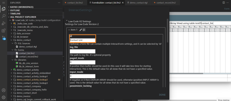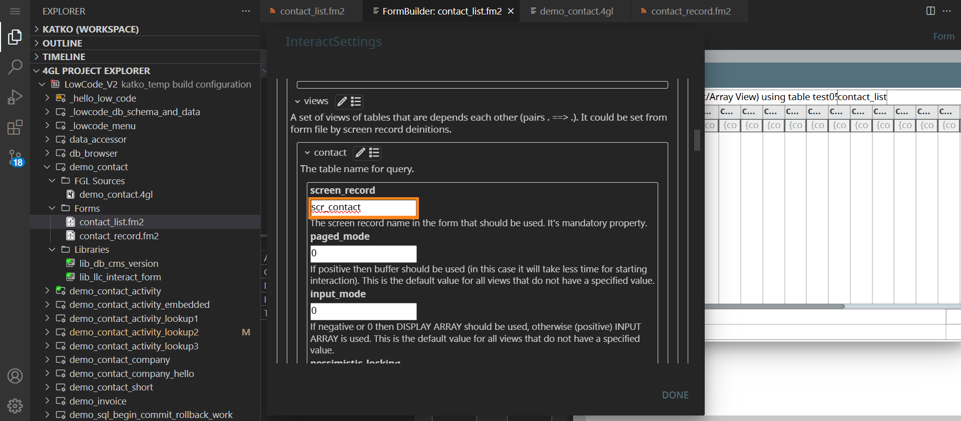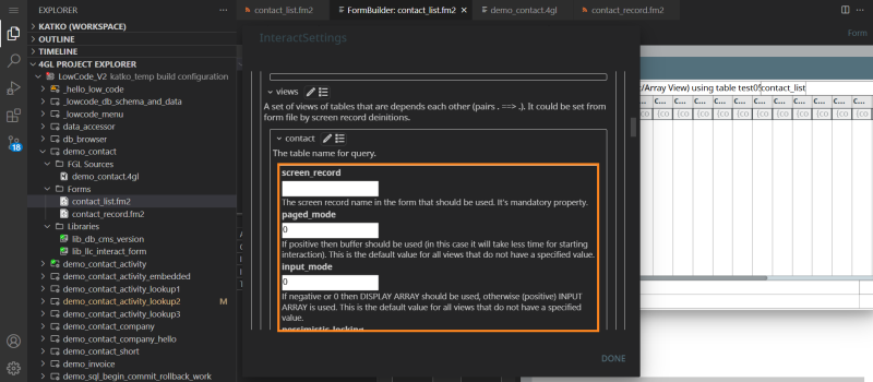| input_mode | INT | If set to 1, adds the INPUT ARRAY interaction. | By default, Lycia LowCode makes DISPLAY ARRAY interaction with Insert, Update, and Delete actions. | Yes | Yes |