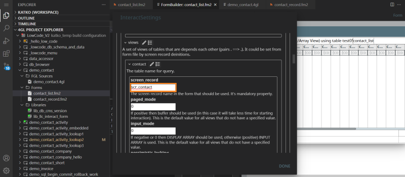 | screen_record | STRING | Mandatory property. Defines the screen record that should be used for interaction. It should be defined in .4gl file or in the .fm2 form file. After merging 4gl-defined and form file-defined settings at runtime, Lycia LowCode should have this property, otherwise it will raise an error. | If this is not set, Lycia LowCode will search for the screen record with the $primary$ prefix (if you had one), use that screen record for interaction, and add the interactSettings property implicitly with the appropriate view definition. | Yes | |