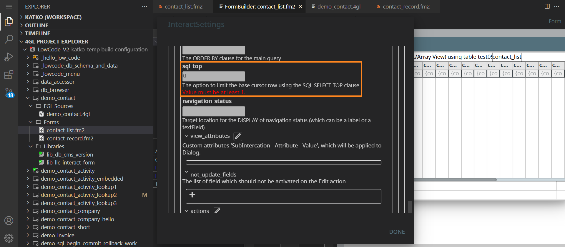 For your convenience, we have added a visual editor for these settings, which you can opt for instead of adding the code to the .4gl file or .fm2 form file. Note that the code added with visual editor appears in the beginning of your .fm2 form file.