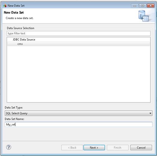 2. Select the data source for which the data set is created, give it a name and click Next.