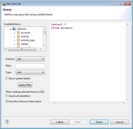 Unlike individual charts and dashboard templates the data sets for the Birt reports can be created directly within the LyciaStudio.