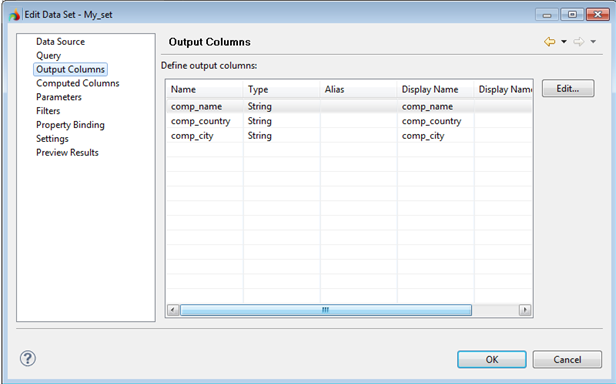 4. Click Finish to save the data set. The edit dialog will open. Here you can change the display names of the columns and values, set parameters, etc.