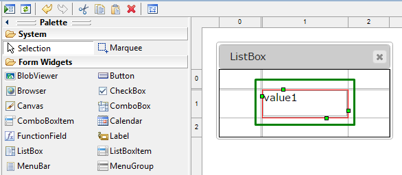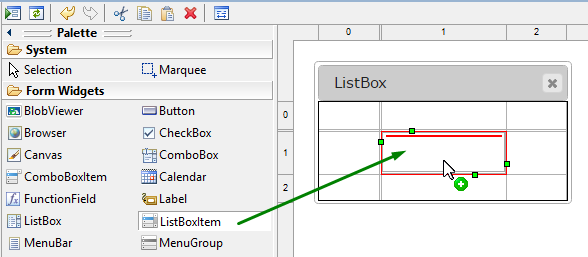 Choose a ListBoxItem widget from the widgets palette by left-clicking its icon: