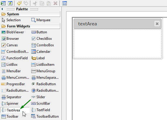 Choose a textArea from the widgets palette by left-clicking its icon: