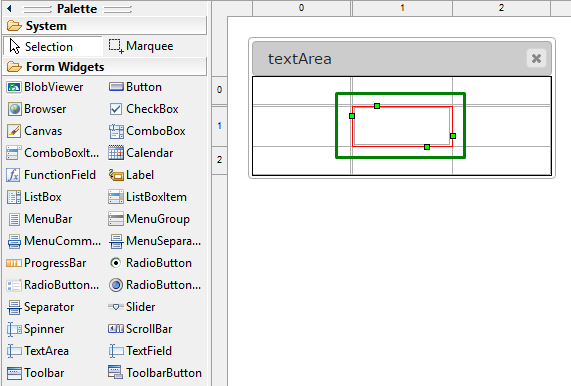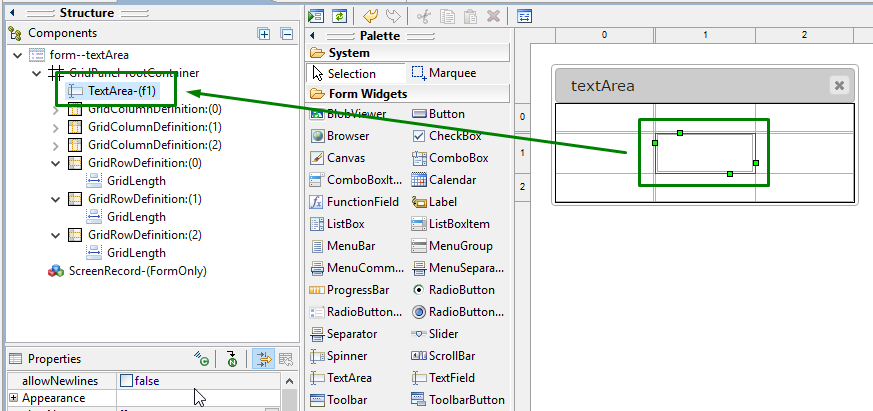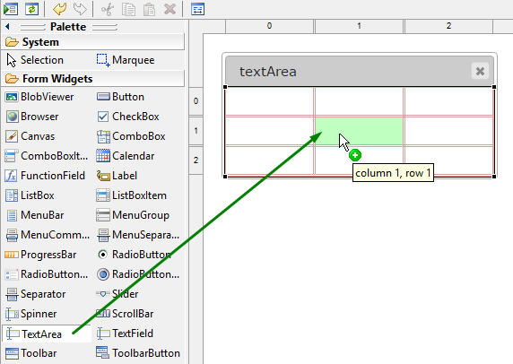 Select the place in the form where you want to put a textArea (in the screenshot below, we choose a cell in a Grid panel):