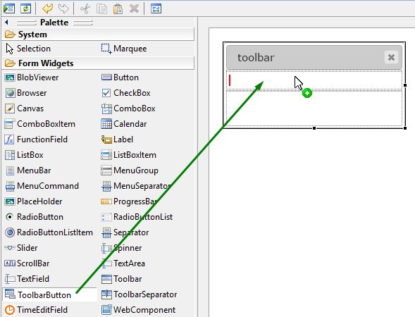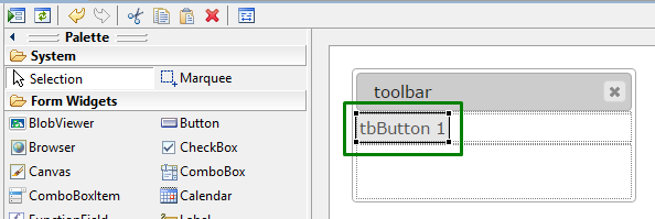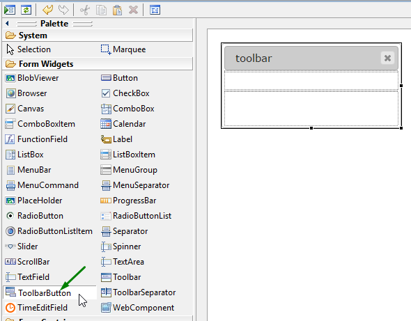 Choose a ToolbarButton widget from the widgets palette by left-clicking its icon: