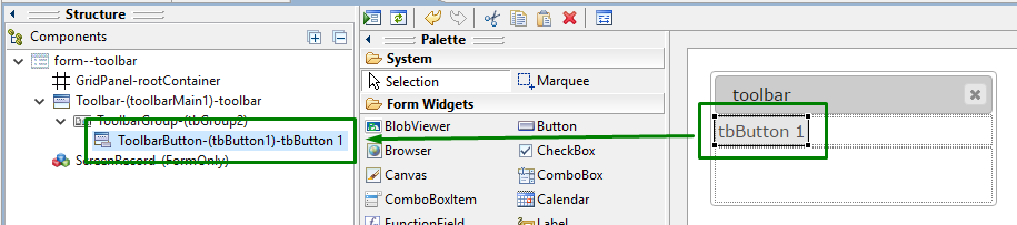 The toolbar button is now added to your form, and you can see it in the Structure view.