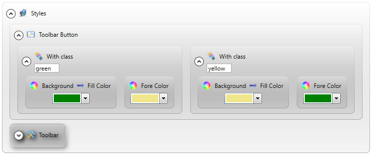... <ElementFilter ElementName="ToolbarButton"> <StyleSheet> <WithClassFilter ClassName="green"> <StyleSheet> <DoStyleAction> <SetProperty> <PropertyPath> <PropertyName>Background</PropertyName> <PropertyName>FillColor</PropertyName> </PropertyPath> <PropertyValue type="CustomizedColor" RedColor="0" GreenColor="128" BlueColor="0" Alpha="255" /> </SetProperty> </DoStyleAction> <DoStyleAction> <SetProperty> <PropertyPath> <PropertyName>ForeColor</PropertyName> </PropertyPath> <PropertyValue type="CustomizedColor" RedColor="240" GreenColor="230" BlueColor="140" Alpha="255" /> </SetProperty> </DoStyleAction> </StyleSheet> </WithClassFilter> <WithClassFilter ClassName="yellow"> <StyleSheet> <DoStyleAction> <SetProperty> <PropertyPath> <PropertyName>Background</PropertyName> <PropertyName>FillColor</PropertyName> </PropertyPath> <PropertyValue type="CustomizedColor" RedColor="240" GreenColor="230" BlueColor="140" Alpha="255" /> </SetProperty> </DoStyleAction> <DoStyleAction> <SetProperty> <PropertyPath> <PropertyName>ForeColor</PropertyName> </PropertyPath> <PropertyValue type="CustomizedColor" RedColor="0" GreenColor="128" BlueColor="0" Alpha="255" /> </SetProperty> </DoStyleAction> </StyleSheet> </WithClassFilter> </StyleSheet> </ElementFilter>