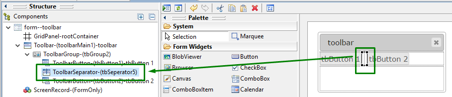 The toolbar separator is now added to your form, and you can see it in the Structure view.