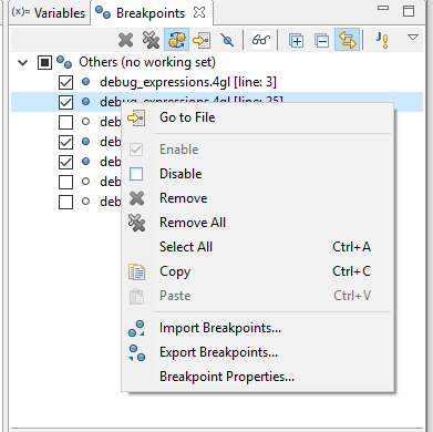 Breakpoints view allows viewing and manipulating breakpoints when the 4gl program is run in the Debug mode.