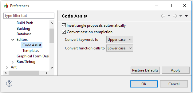 In the Code Assist sub-page, you can change the behavior of the code assist:
