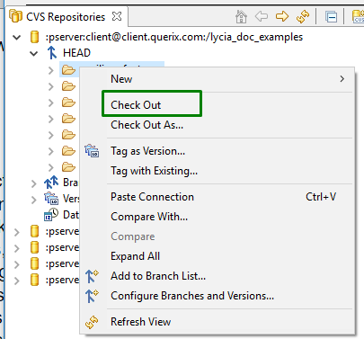 § with help of the Check Out and Check Out As commands from the context menu of the CVS Repositories view.
