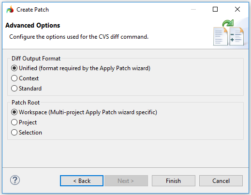 Choose where to save the patch. § Clipboard - the patch will be saved to the clipboard (is advisable for small patches); § File system - the patch will be saved to the specified file in the file system (is generally preferable); § Workspace - the patch will be saved to the specified file in one of the existing workbench projects.