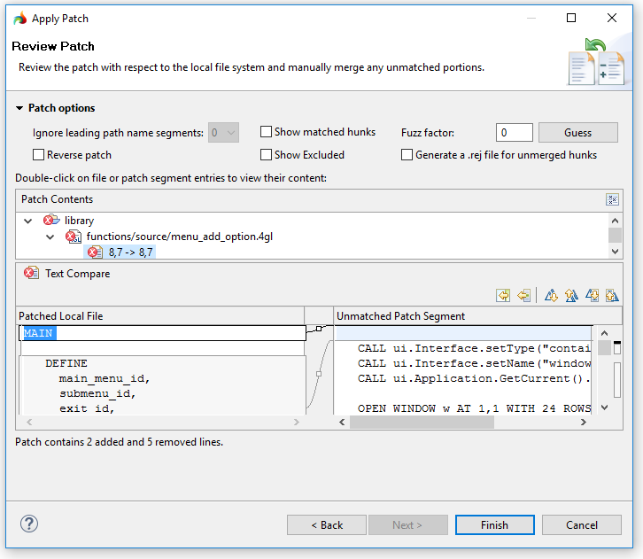 Press Finish to apply the selected patch. Now the workspace contains all the outgoing changes for each file modified by the patch: