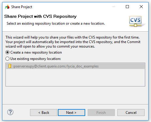 Two options are available here: Create a new repository location - allows creating a new repository location or opening the already existing repository location that you haven't opened yet, Use existing repository location - allows going to the repository location that you have already opened once (in this case, you do not need to go through Steps 5-7 described below).