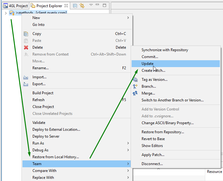 To update the project in your workspace, right-click the necessary project in the Project Explorer view and select Team > Update in the context menu: