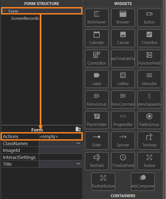 Every form element of a .fm2 form file has a property, Actions, that allows creating triggers for application actions: