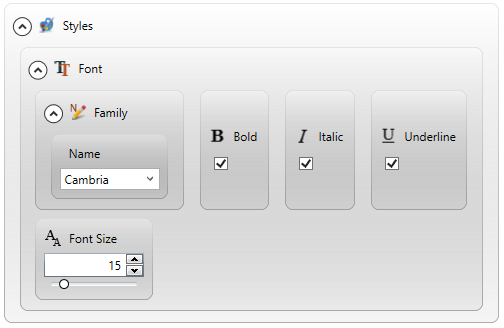 <?xml version="1.0" encoding="utf-8"?> <StyleSheet xmlns="http://querix.com"> <DoStyleAction> <SetProperty> <PropertyPath> <PropertyName>Font</PropertyName> </PropertyPath> <PropertyValue type="Font" Bold="True" Italic="True" Underline="True" FontSize="15"> <Family> <Name>Cambria</Name> </Family> </PropertyValue> </SetProperty> </DoStyleAction> </StyleSheet> |