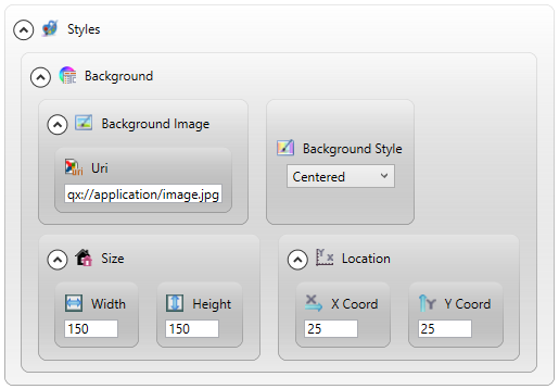 <?xml version="1.0" encoding="utf-8"?> <StyleSheet xmlns="http://querix.com"> <DoStyleAction> <SetProperty> <PropertyPath> <PropertyName>Background</PropertyName> </PropertyPath> <PropertyValue type="Background" BackgroundStyle="Centered"> <BackgroundImage type="ResourceId" Uri="qx://application/image.jpg" /> <Size Width="150" Height="150" /> <Location XCoord="25" YCoord="25" /> </PropertyValue> </SetProperty> </DoStyleAction> </StyleSheet> |