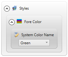 <StyleSheet xmlns="http://querix.com"> <DoStyleAction> <SetProperty> <PropertyPath> <PropertyName>ForeColor</PropertyName> </PropertyPath> <PropertyValue type="CustomizedColor" RedColor="0" GreenColor="128" BlueColor="0" Alpha="255" /> </SetProperty> </DoStyleAction> </StyleSheet> |