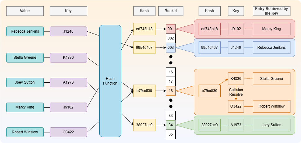 Bucket Value: Data are stored in the HashMap bucket, which can be of a primitive data type, structured, or a complex one. You can even nest HashMaps in the HashMap bucket.