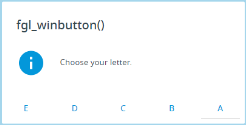 CALL fgl_winbutton("fgl_winbutton()", "Choose your letter.", "", "A|B|C|D|E", "info", 1)