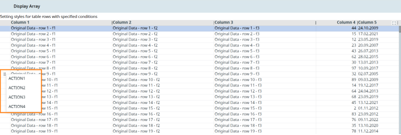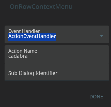 Step 1. In the Properties view, find the property named OnRowContextMenu, and double-click its value to open the dialog. In the Event Handler, select the ActionEventHandler option, and assign a name for your action: