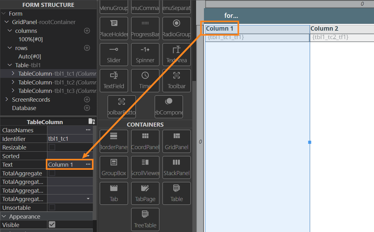 To add a table to your form, find a Table container in the Palette view, then drag-and-drop it into the parent container in the Editor area: