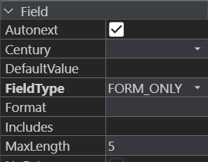 The property is particularly useful with fields intended for the data strings of a certain standard length (like birth and application dates, numeric postal codes, tax reference numbers, etc.). autonext can also be used for the fields 1 byte long in order to increase the interface user-friendliness (in this case one and the same keystroke will enter data and move input to the next field).