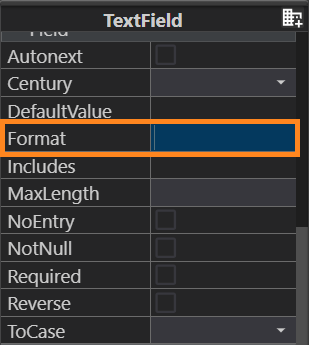 With numeric form fields – of the DECIMAL, SMALLFLOAT, and FLOAT data types, – format is used to specify the location of the decimal point and the digit grouping symbol.