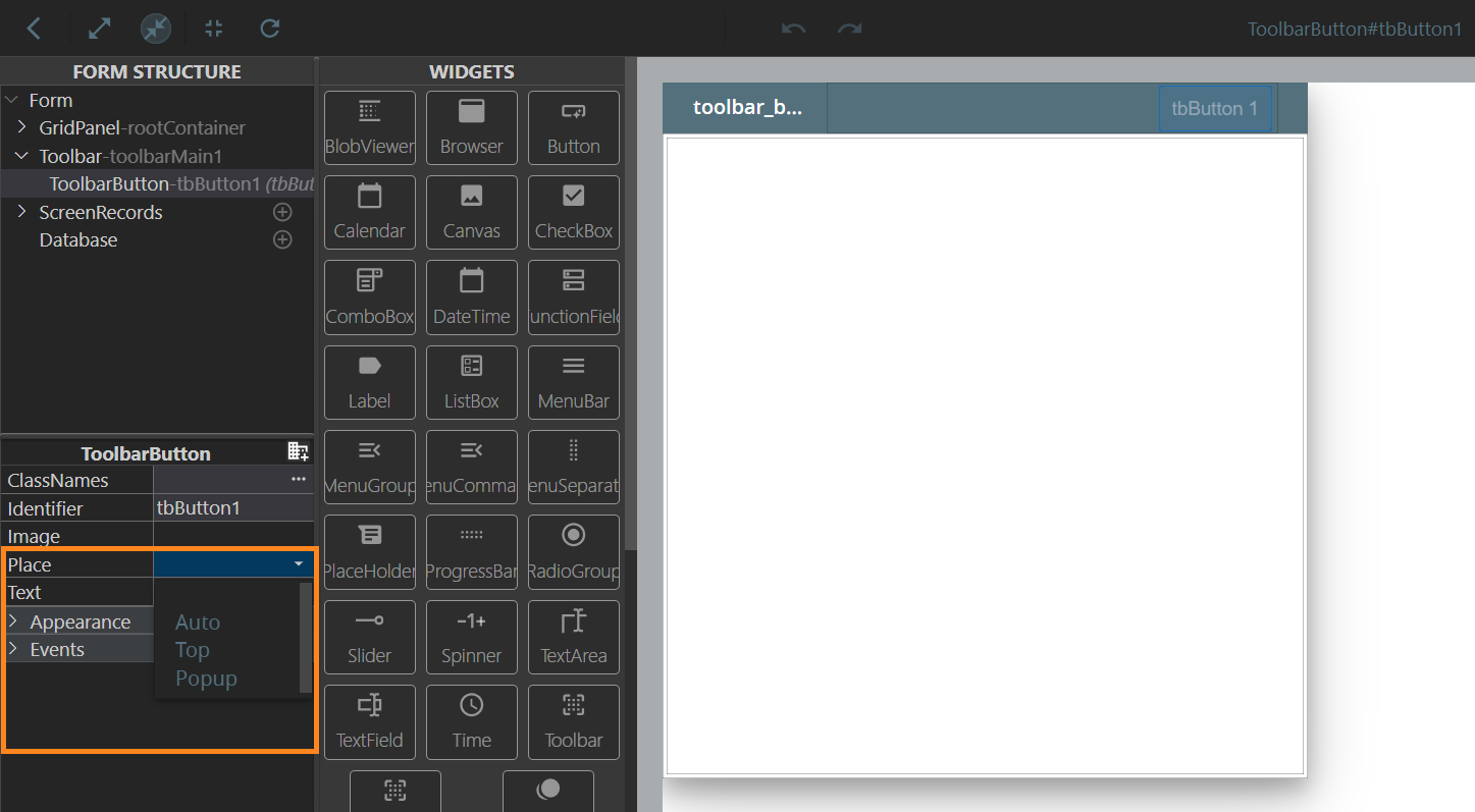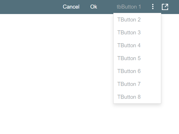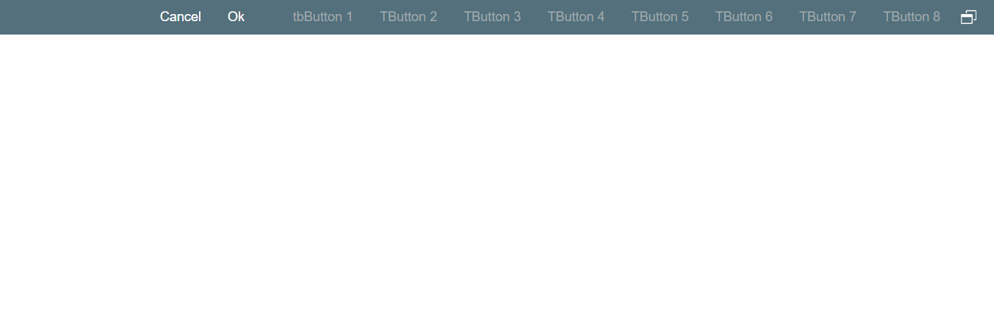 There is a special way to rearrange Toolbar Buttons. With the ClassName tbutton-default-place-popup specified for the application, the default is turned to popup instead of top / auto. All buttons that don’t have the place property set explicitly are placed in the dropdown list.