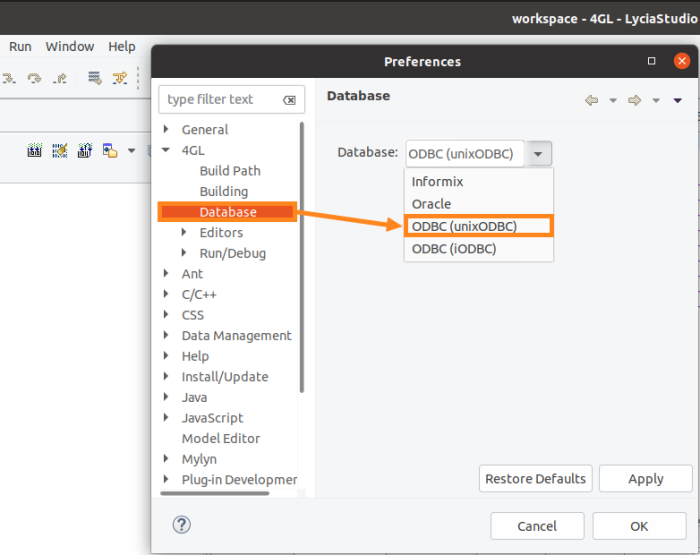 Step 5. For compilation in LyciaStudio, go to Window → Preferences → 4GL → Database, and change the database type to unixODBC:
