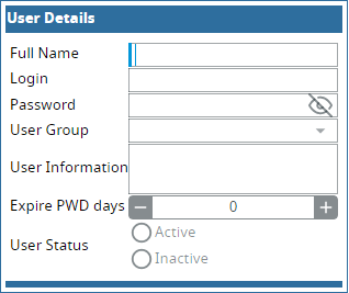The user account consists of Full Name, Login(name is used to log in), password(is used to log in), user group(defines user permissions), User Information(some additional information about user), Expire PWD days(defines how many days password is valid. After it expire user will be requested for changing the password on login step)